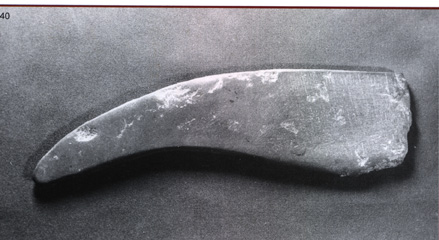砭镰(商代) 形质:石质;长20cm,最宽处5.4cm 出土时间:1973年 出土地点:河北藁城台西村商代第14号墓 收藏单位:河北省博物馆藏 简介:砭镰出土时置墓西侧二层台上一具长方形漆盒内。砭镰末端未见安柄痕迹。经考证系当时的医疗用具。