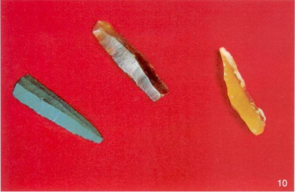 玛瑙石叶(新石器时代) 出土地点:内蒙古乌盟头道洼遗址 质地:玛瑙 大小:长约2cm 收藏单位:陕西医史博物馆藏 简介:绿色一件,赭色两件,有锋刃,先民们可用于放血、破痈。
