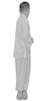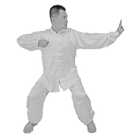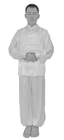1.调身:两脚并拢,自然站立,目视前方。双臂自然下垂于体侧,手掌朝内。躯干及头颈部保持中正,轻闭双唇,舌尖轻贴上腭,眉心舒展,下颌微收,似笑非笑。