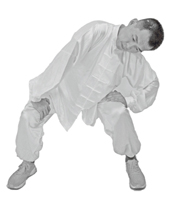 1.调身:重心右移,左脚向左迈开一步,大致两肩宽,双腿屈膝下蹲成马步,两手自体侧拢气上升,抬至胸前交叉,左手在外呈剑指,右手在内握固。接着向左做拉弓状,剑指指尖向上,转头凝视远方,拉至极致,停顿片刻。两腿直起,两手臂伸展向下划弧拢气,还原体侧。再换右侧,重复如上动作,左右交替6~9次。