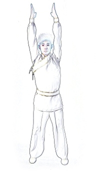 (1)拳松转手,沿体侧,上肢上举,掌心向上,膝随手走,渐至伸直至双上肢平行,掌心相对。