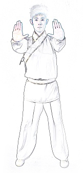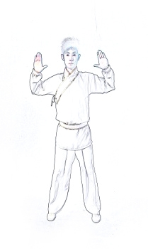 (3)双手前推,双眼圆睁。同时双足足趾尽量上翘。保持此姿势一段时间。