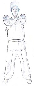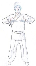 (1)重心右移,左脚向左开立大半步,膝随手动,双膝伸直,双手上抬至平胸,掌心向上。