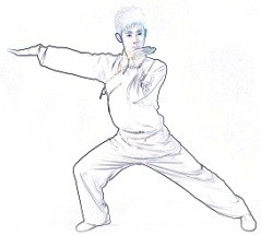 (5)手掌向下,上肢沿体侧落下,重心右移,左腿向右收回,恢复起式。