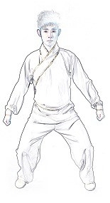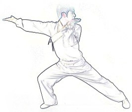 (4)左手推颈左转的同时,右手转掌向上,右膝屈曲,成侧弓步。