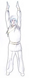 (1)松拳转手,手掌向前,上肢侧举,膝随手直。