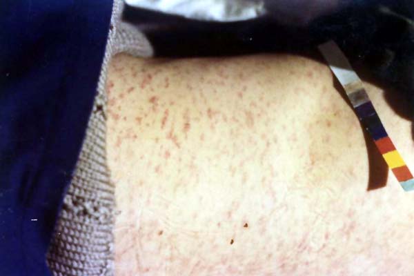 关键词:麻疹胸。 麻疹胸的形象为:躯干红疹稀疏。 主病:成人麻疹,湿温营卫合邪,湿热入营,气阴两伤。 病例:麻疹,气管炎,扁桃体炎,肠炎。
