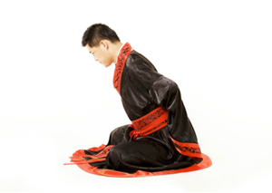 3.接上式,两手从指尖开始捲握成空拳,同时两拳向后划弧,至拳眼轻轻抵在骶骨两旁。