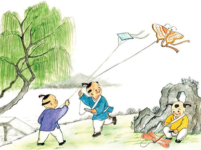 放风筝是我国民间广为盛行的一项传统娱乐活动。早在唐朝人们就非常喜欢放风筝,经常在闲暇之际,去郊外和空旷之处放风筝娱乐。唐代诗人路德延《小儿诗》有:“折竹装泥燕,添丝放纸鸢。”描写的就是少年儿童们用竹条制作了一只燕子形状的风筝,将其放上天空的情景。元稹《有鸟》诗也描写了儿童放风筝的情景“有鸟有鸟群纸鸢,因风假势童子牵。”