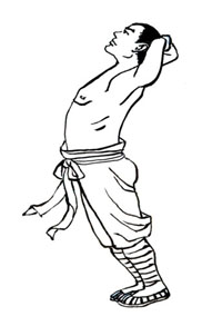 两手抱后脑,抬头、挺胸、挺腹、挺小腹、挺腹股沟。