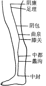 (2)取俯卧位,丈夫用拇指指腹端依次点揉心俞、膈俞、肝俞、胆俞、脾俞、胃俞、三焦俞、膏肓穴各2分钟。然后改仰卧位,丈夫依次点揉百会、上星、阴廉(在大腿内侧,当气冲直下,大腿根部,耻骨结节的下方,长收肌的外缘,图5—2)、足三里、会阴穴各1分钟。