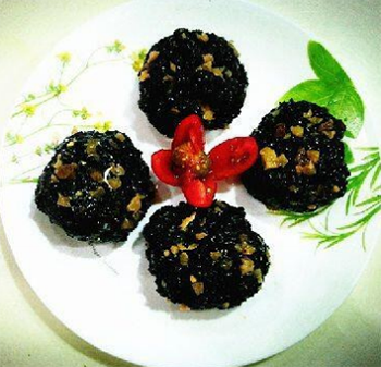 做法:乌米洗净,入高压锅煮熟后盛出放凉。榨菜剁成碎末,取鸭蛋黄备用。手沾点凉水,取一份乌米饭,在手上反复摔实,再捏出一个小窝,放入咸蛋黄后,封好口,再用手反复搓圆。在乌米团子上撒入榨菜末后,即可食用。