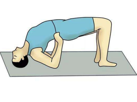 仰卧位双膝屈曲,以双足跟、双肘、头部为支点,抬起臀部,尽量把腹部与膝关节抬平,然后缓慢放下,一起一落为一个动作,连续20~30次。