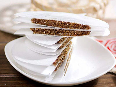 上文说到的茯苓饼,除了宫廷的精细配料外,还有多个配方,方多有变,不变的是茯苓。苏东坡《东坡杂记》中记述服食茯苓饼的功效和制作方法:以九蒸胡麻,用去皮茯苓,少入白蜜,为饼食之,日久气力不衰,百病自去,此乃长生要诀。又有所谓秘传茯苓饼,取茯苓、米粉各等量,拌匀,加水调成糊,摊烙成薄饼,做成饼皮。另取四分之一量的蜂蜜、砂糖,放在锅里熬,蒸发掉一些水分,再将切细的核桃仁及桂花放入糖中拌匀做馅。最后,取馅放在摊平的饼皮上,在馅料上再覆盖一张皮子,稍烙一下,即成美味的茯苓夹饼。