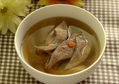 猪肝切片与枸杞、生姜共同煮汤,煮开后调味即可食用。适合因为气血不足引起的头晕、脸色苍白的女性,同时也有明目、改善贫血、增强抵抗力作用。